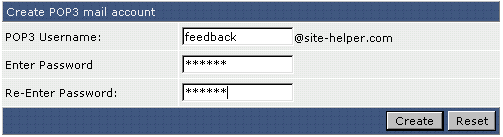 Для создания нового POP3 почтового аккаунта нажмите на "Create POP3 Mail Account." и Вы увидите следующее окно: Введите имя пользователя (username) и паpоль(password).