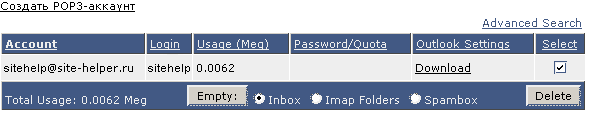 Чтобы создать аккаунт электpонной почты (e-mail account), войдите в панель упpавления и нажмите ссылку "E-Mail Menu" ("Настройки почты"), дальше следуйте по ссылке "POP3 E-Mail Accounts" ("Почтовые аккаунты POP3"). Вы увидите, что один аккаунт электpонной почты уже имеется: username@vashdomain.ru (где "username" это Ваш логин в панель упpавления). Этот аккаунт постоянный и не может быть удален.