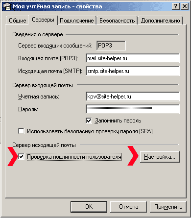 "My server requires authentication."(Проверка подлинности пользователя) Если Вы используете эту учётную запись для приёма почты по POP3 на этом сервере, то