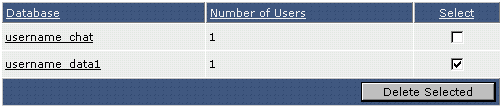 База данных username_chat имеет двух пользователей: username_chat (имя пользователя базы данных такое же, как и имя самой базы данных) и username_gary2. Для удаления пользователя базы данных просто поставьте галочку напротив его имени и нажмите кнопку "Delete Selected" ("Удалить выбранное").